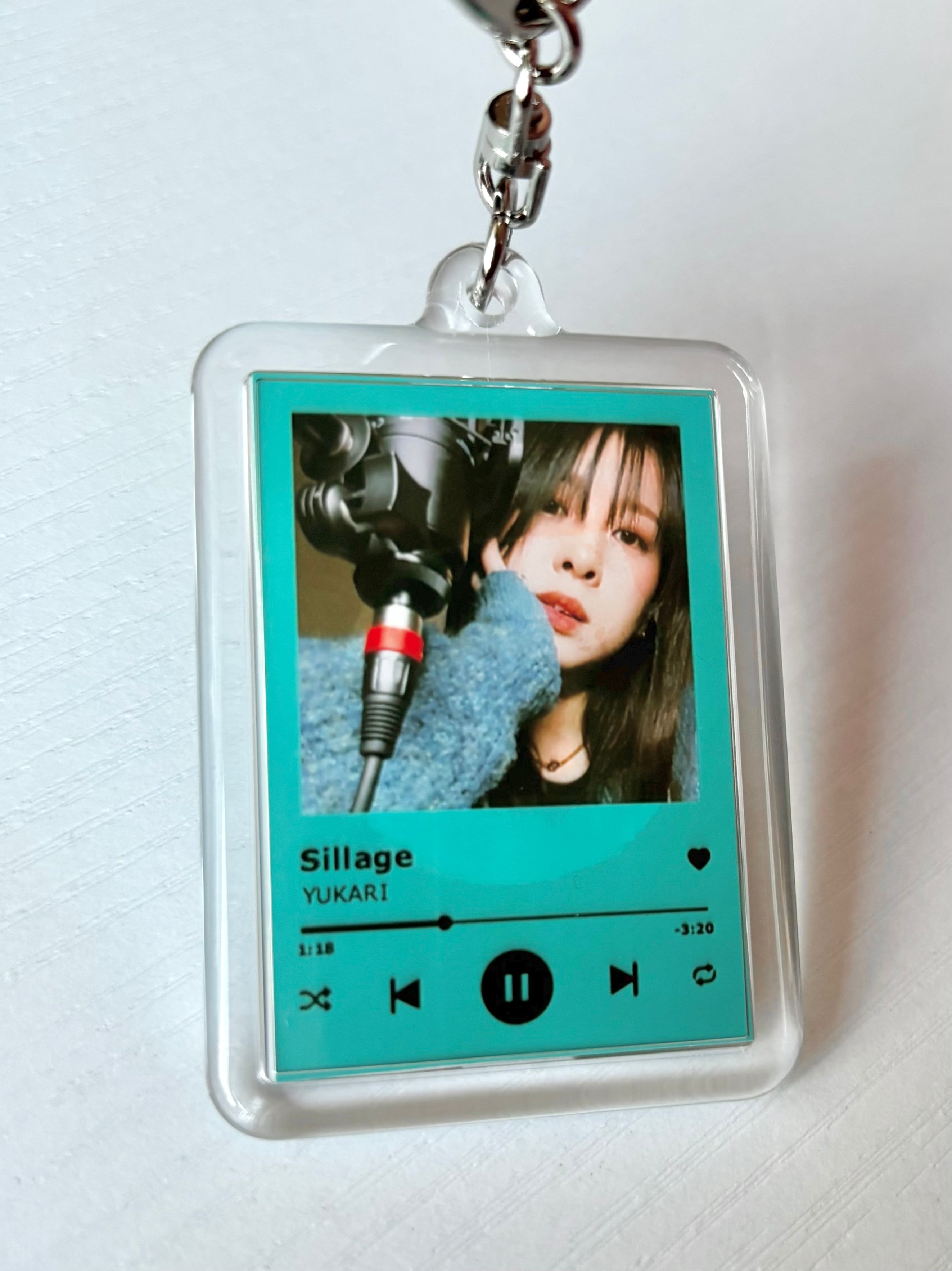 ミュージックプレイヤーのようなデザインのキーホルダー。裏面はYUKARIサイン。