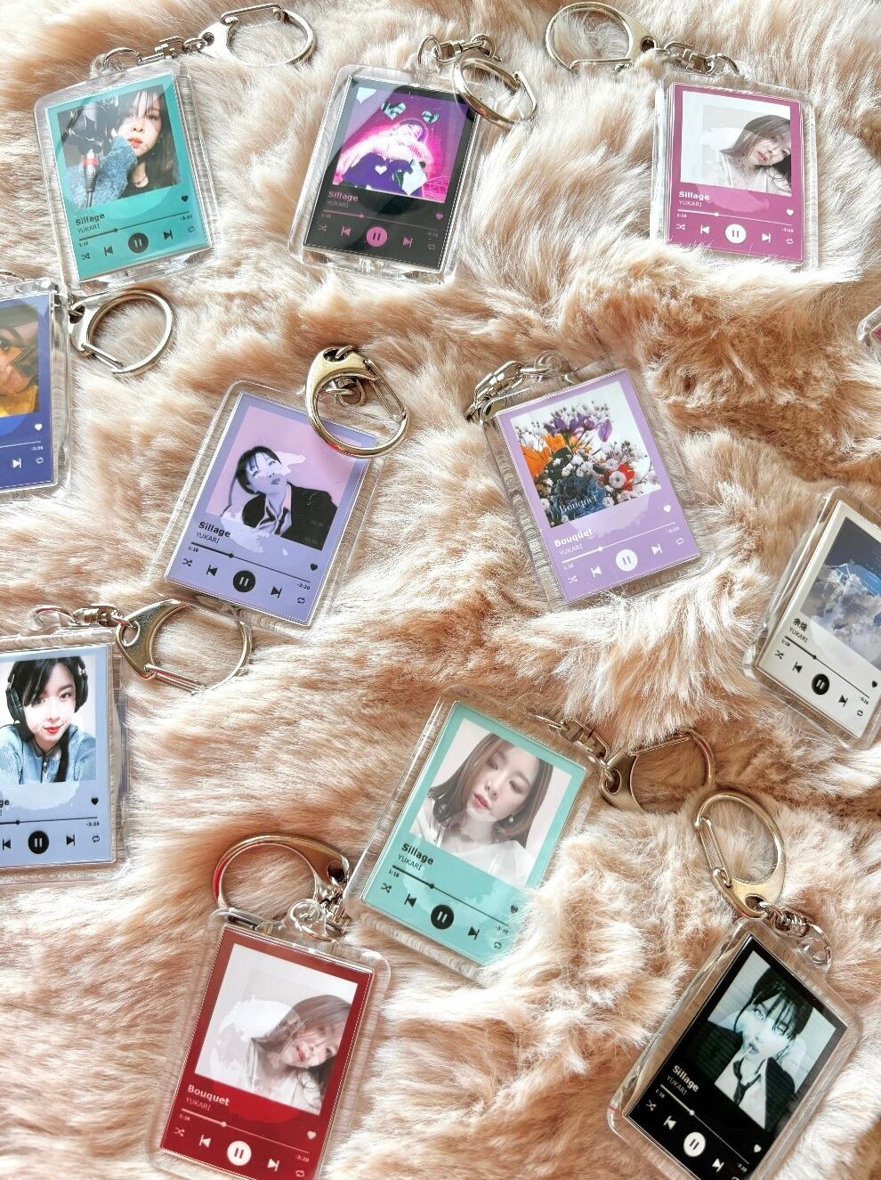ジャケット写真部分にはYUKARIの写真やオリジナル曲のジャケット写真がデザインされており、色によってデザインも違うため自分の好きな色やデザインで組み合わせて複数付けも楽しめます。つけ外しも簡単な金具パーツなのでその日の気分で付け替えられます。