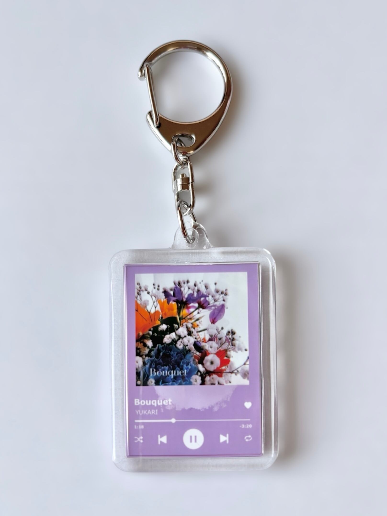 ミュージックプレイヤーのようなデザインのキーホルダー。裏面はYUKARIサイン。